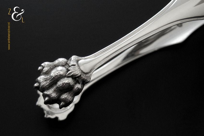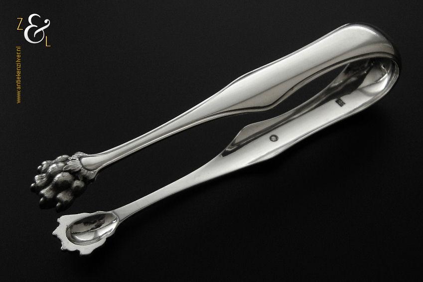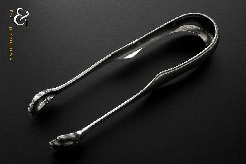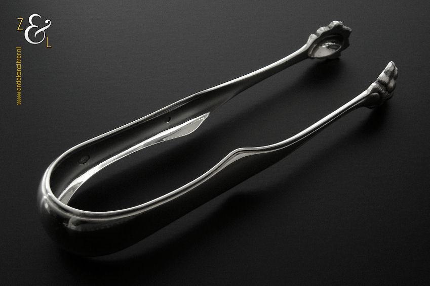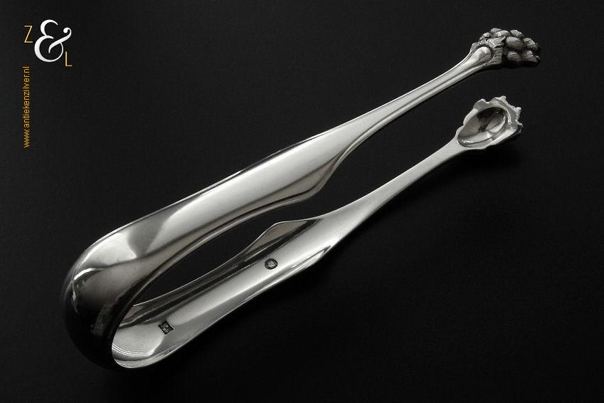 Deze suikerklontjestang / ijsklontjestang is gemaakt in Rotterdam door Willem Baksteen & Cornelis Johannes Middendorp (meesterteken B&M boven ster in rechthoek) in het jaar 1870 (jaarletter L). De zilveren Neostijl suikerklontjestang / ijsklontjestang is uitgevoerd met een filetrand en heeft klauwpootjes waardoor hij ook goed te gebruiken is voor ijsklontjes. De tang weegt 40 gram en is 13 cm lang.