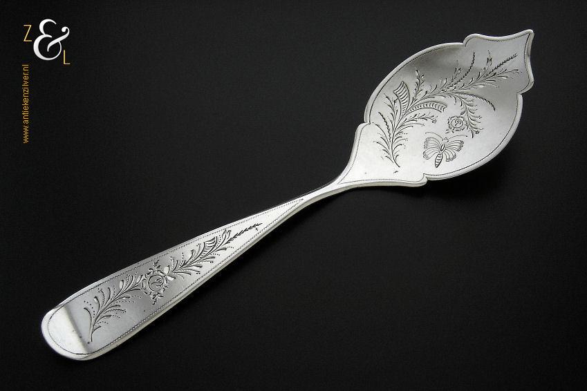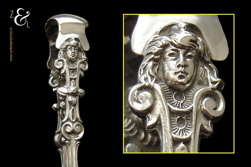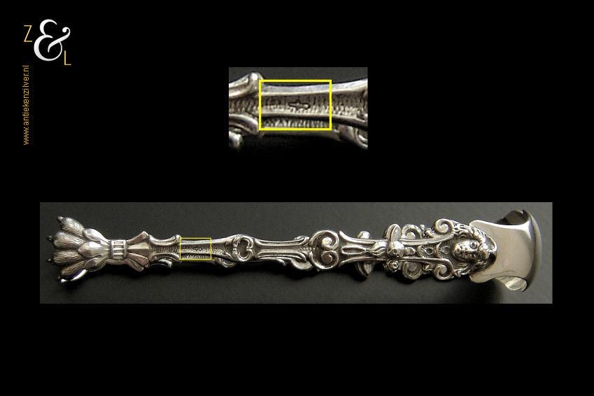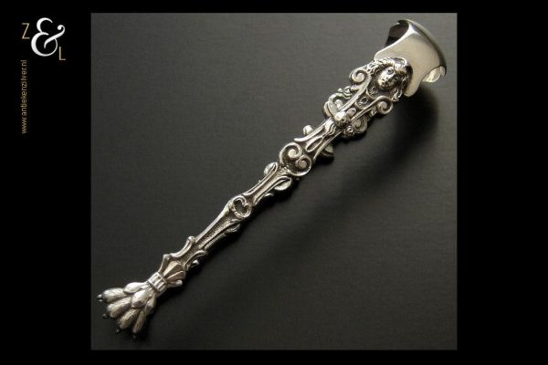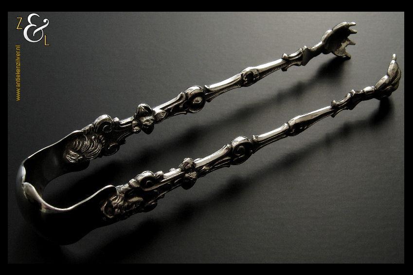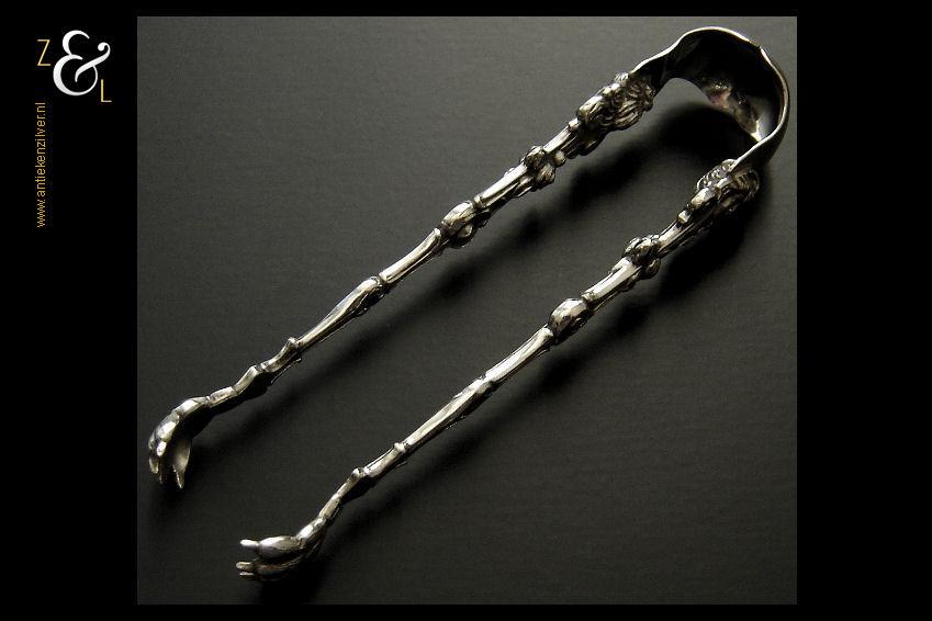 Suikerklontjestang / kandijtang gemaakt in Nederland tussen 1906 en 1953 (gekeurd met het zilverkeur zwaardje). Deze in Neostijl uitgevoerde zilveren suikerklontjestang / kandijtang weegt 36 gram en is 11 cm lang.