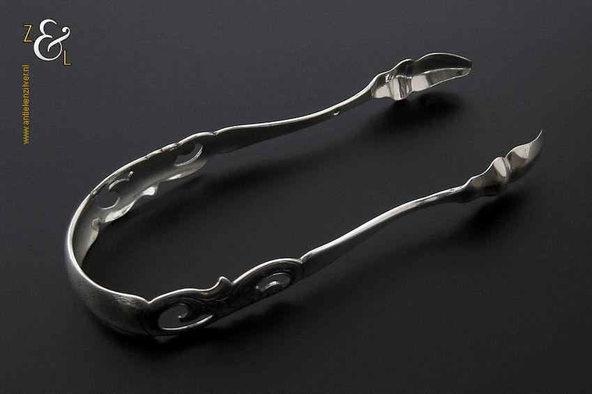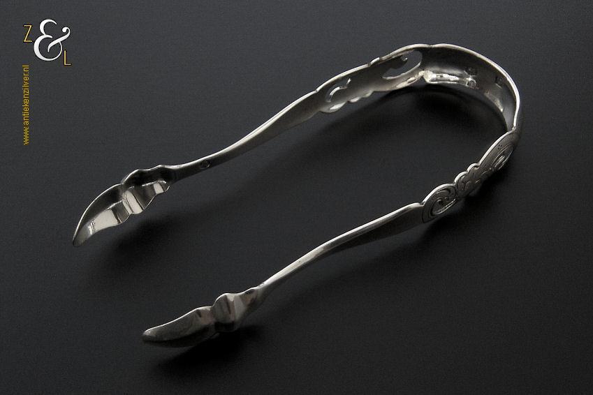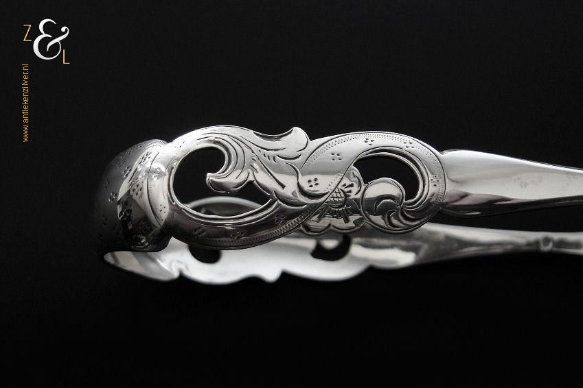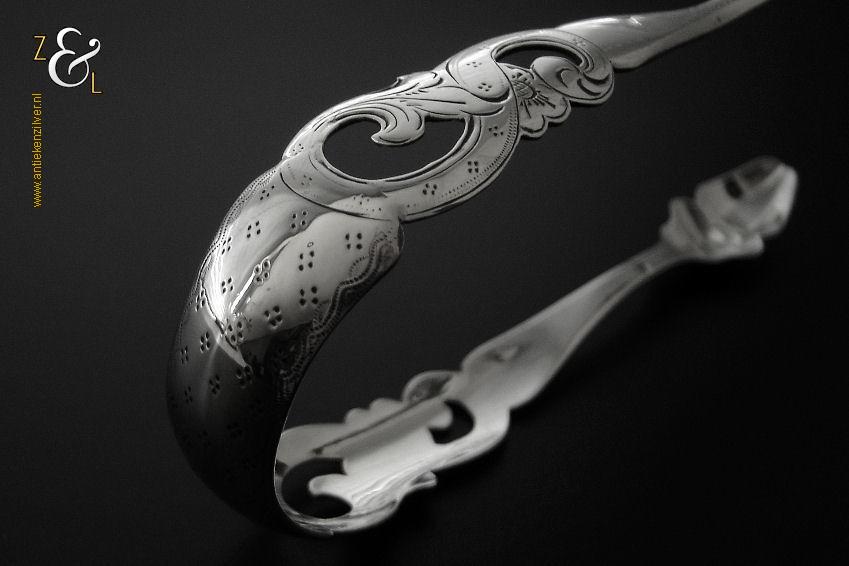 Deze suikerklontjestang / kandijtang is gemaakt in Den Bosch / ‘s-Hertogenbosch door Augustinus de Rooij (meesterteken AR boven 5 in vierkant) in het jaar 1881 (jaarletter W). De zilveren Biedermeier suikerklontjestang / kandijtang is uitgezaagd en gegraveerd met een stippelmotief en c-vormige voluten. De tang weegt 31 gram en is 13.5 cm lang. De tang heeft aan de binnenzijde wat kleine soldeerplekjes (zie foto’s).
