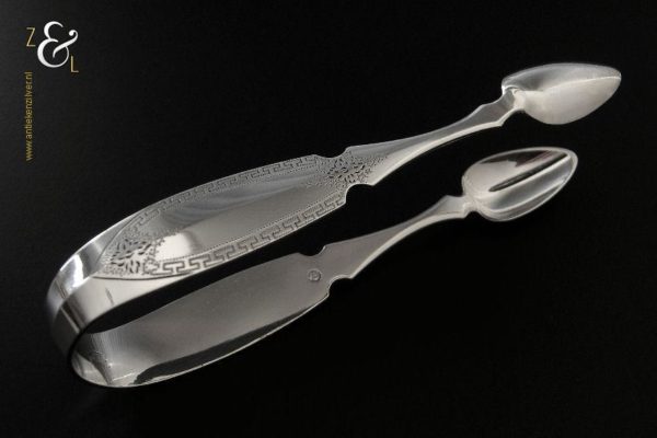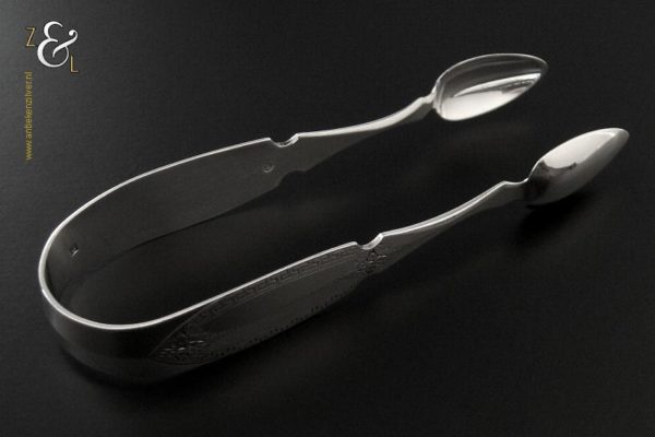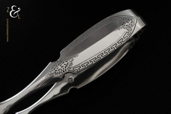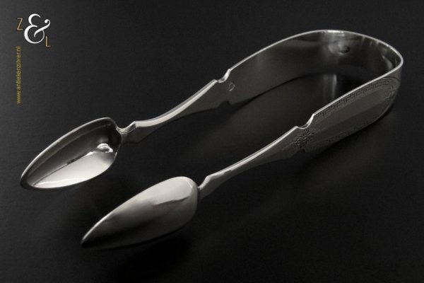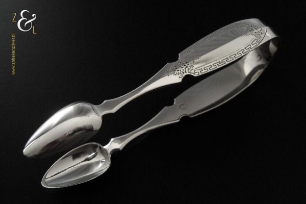 Deze suikerklontjestang / kandijtang is gemaakt in Schoonhoven door Adrianus Kuijlenburg (meesterteken AK boven 47 in vierkant) in het jaar 1876 (jaarletter R). De zware zilveren Neostijl suikerklontjestang / kandijtang waarvan de stelen fijntjes gegraveerd zijn met een meandermotief weegt 48 gram en is 13.1 cm lang.