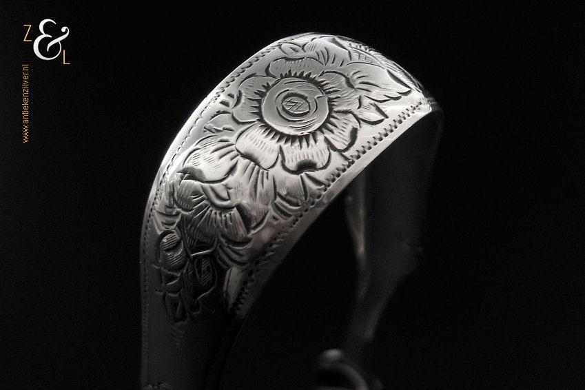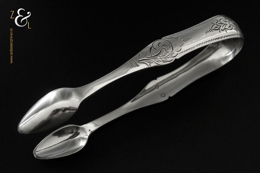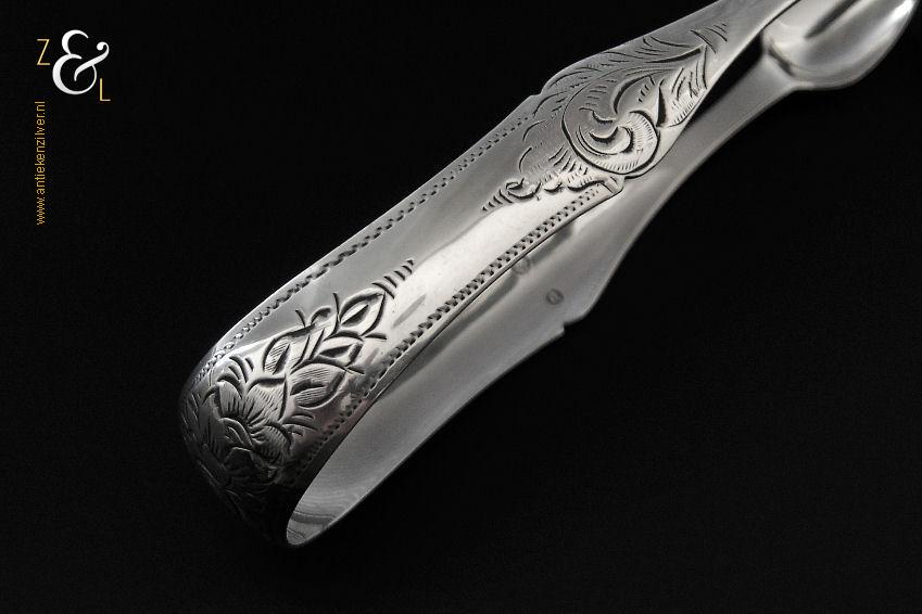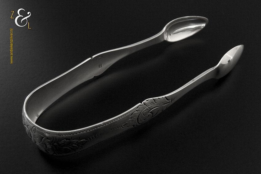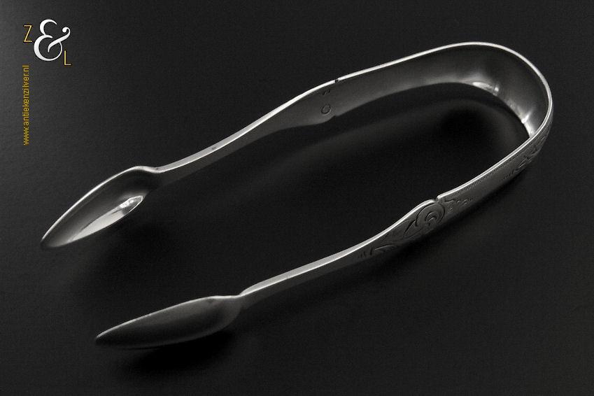 Deze suikerklontjestang / kandijtang is gemaakt in Amsterdam door Johannes Hendrikus Tarner (meesterteken HT onder lepel in vierkant) in het jaar 1860 (jaarletter A). De zilveren Biedermeier suikerklontjestang / kandijtang is gegraveerd met c-vormige voluten en een bloemmotief. De tang weegt 29 gram en is 12.4 cm lang.