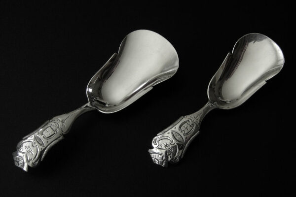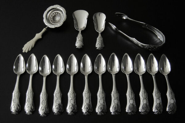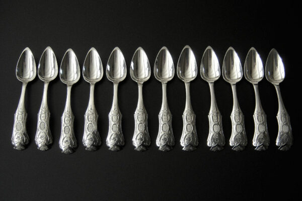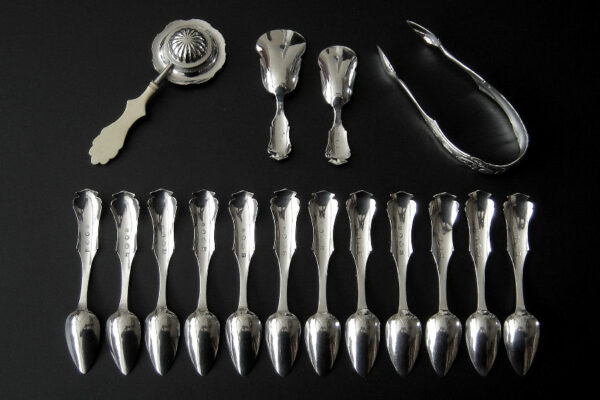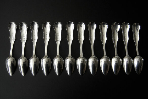 –De twaalf theelepels wegen samen 127 gram zijn 12.7 cm lang en hebben het jaarletter U voor 1854.
