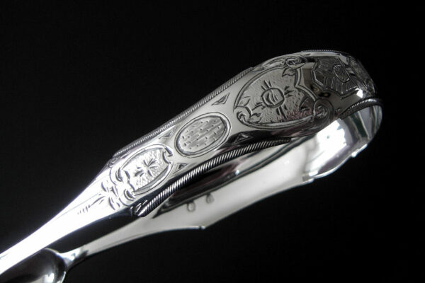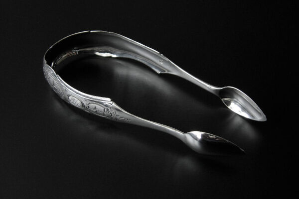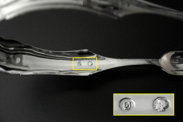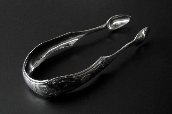 – De suikerklontjestang / kandijtang weegt 29 gram is 13.2 cm lang en heeft het jaarletter U voor 1854.