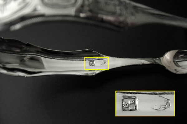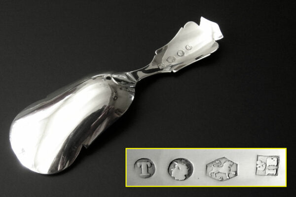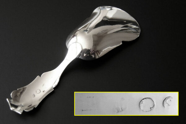 –De suikerschep weegt 10 gram is 9.2 cm lang en heeft het jaarletter T voor 1853.