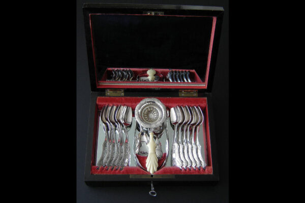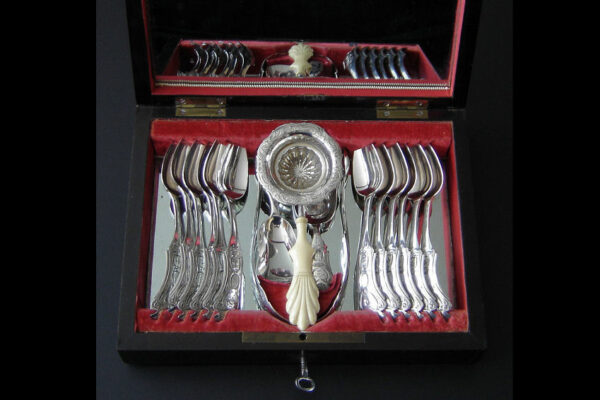 Theegarnituur gemaakt in Amsterdam door Jan Hendrik Eversbag (meesterteken anker boven I E in vierkant) in het jaar 1854 (jaarletter U). De jaarletter U op dit garnituur heeft een stip, dit geeft aan dat de keurmeester tijdens dit jaar werd opgevolgd of overleden was. Van het theegarnituur zijn de theeschep / theeduim en de suikerschep in twee opeenvolgende jaren 1952 (jaarletter S) 1953 (jaarletter T) gemaakt. De theezeef is gekeurd met het zilverkeur zwaardje (dit is het gehaltemerk voor kleine zilveren werken) dat tussen 1814 en 1905 in gebruik was. Het zilveren Biedermeier theegarnituur dat uit zestien delen bestaat is diep gegraveerd en alles is voorzien van het meesterteken van Jan Hendrik Eversbag.
