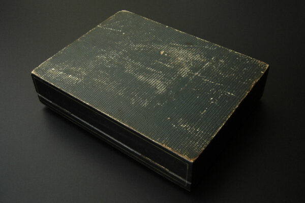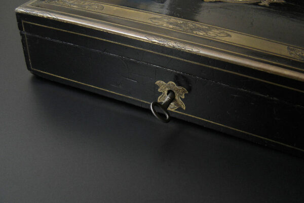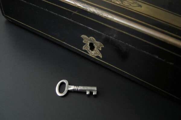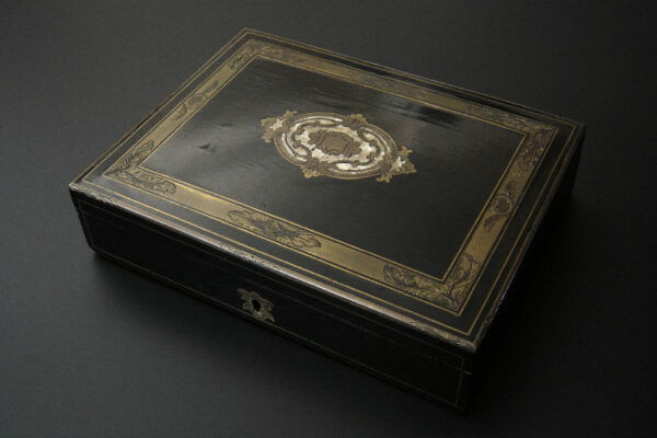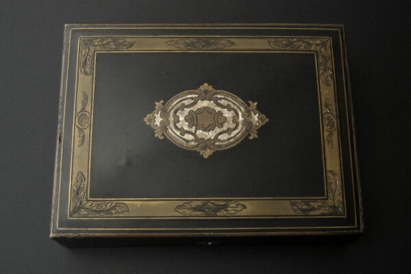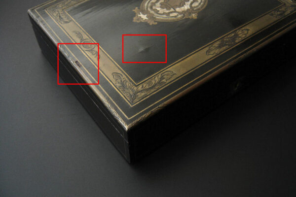 –De kist / cassette is uitgevoerd in de Boulle techniek en is met gegraveerd messing en parelmoer ingelegd. Tevens is de kist / cassette geëboniseerd, dit is het zwart maken van een van nature lichter gekleurd hout zodat het meer op zwart ebbenhout lijkt. De binnenkant van de kist / cassette is bekleed met rood velours en heeft zowel in het deksel als op de bodem een spiegel. De kist / cassette is 21 cm lang bij 15.8 cm breed 5 cm hoog. De kist / cassette opent en sluit uitstekend maar heeft een sleutel waarbij het slot niet werkt. De kist / cassette heeft gebruikssporen (zie tevens de rood omkaderde gedeeltes op de afbeelding).