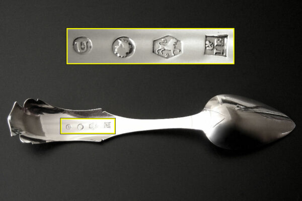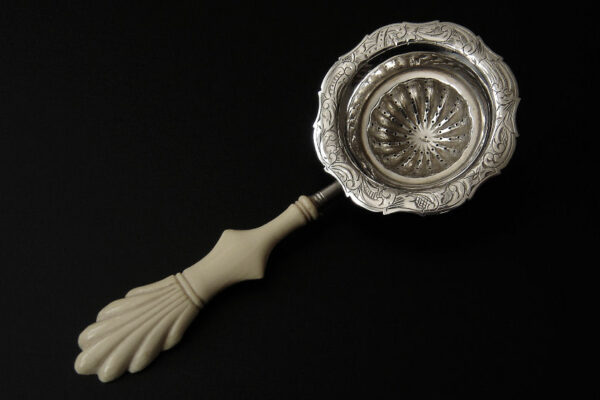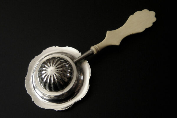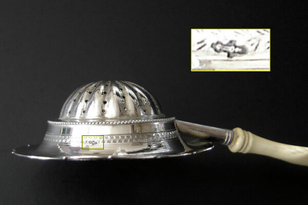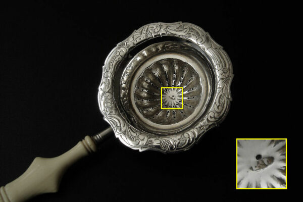 – De theezeef weegt 17 gram heeft een bak met een diameter van 5.3 cm is 13.4 cm lang en heeft een benen heft van 6.8 cm lang met aan het uiteinde een waaier / palmet motief. De theezeef is in de bak gestempeld met een meesterteken en is gekeurd met het zilverkeur zwaardje dat tussen 1814 en 1905 in gebruik was (zie geel omkaderde gedeeltes op de afbeeldingen).