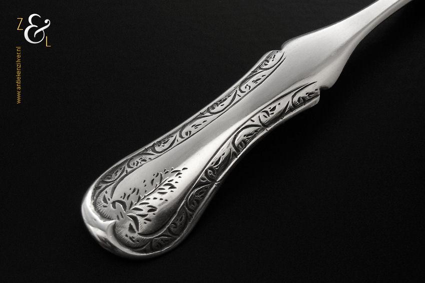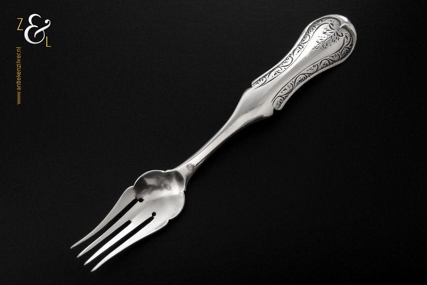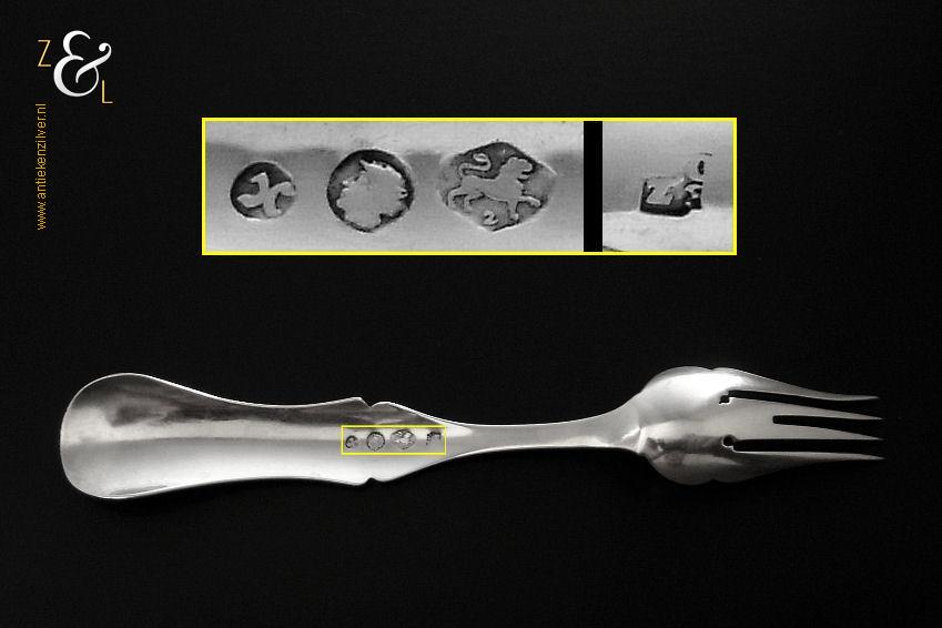 Deze belegvork / zuurvork is gemaakt in Amsterdam door Theodorus Lambertus & Pierre Louis Uriot (Firma T.L. Uriot & Zoon) (meesterteken TU boven Z3 in vierkant) in het jaar 1882 (jaarletter X). De zilveren Biedermeier belegvork / zuurvork is uitgevoerd in model hartfilet en heeft langs de rand van het handvat een gravering van c-vormige voluten. De belegvork / zuurvork weegt 11 gram en is 12.2 cm lang.