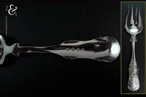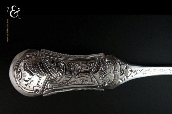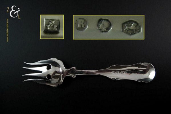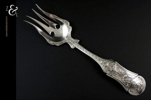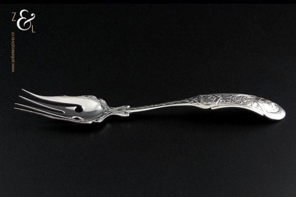 Belegvork / zuurvork gemaakt in Amsterdam door Jan Hendrik Eversbag (meesterteken anker boven I E in vierkant) in het jaar 1851 (jaarletter R). Deze mooie zilveren Biedermeier belegvork / zuurvork is geheel gegraveerd met C-vormige voluten, weegt 27 gram en is 16.7 cm lang.