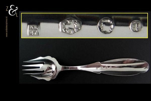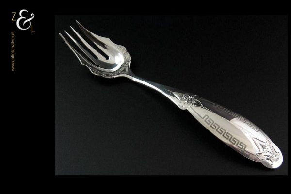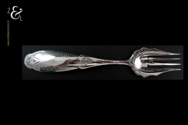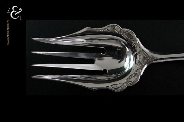 Deze belegvork / zuurvork is gemaakt in Schoonhoven door Adrianus Kuijlenburg (meesterteken A K boven 47 in vierkant) in het jaar 1874 (jaarletter P). Van deze stevige zilveren Biedermeier belegvork is de steel gegraveerd met een meandermotief. De belegvork / zuurvork weegt 21 gram en is 15.8 cm lang.