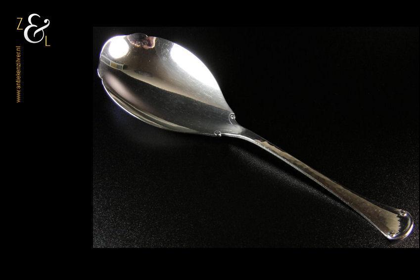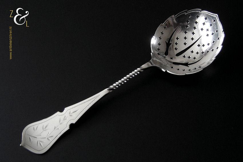 Belegvork / zuurvork gemaakt in Voorschoten bij de Firma J.M. van Kempen & Zonen (meesterteken liggend maantje tussen punten boven VK in vierkant) in het jaar 1897 (jaarletter N). Deze zilveren Jugendstil belegvork / zuurvork heeft een getordeerde steel en handvat met parelrand. De belegvork / zuurvork weegt 31 gram en is 16.6 cm lang.