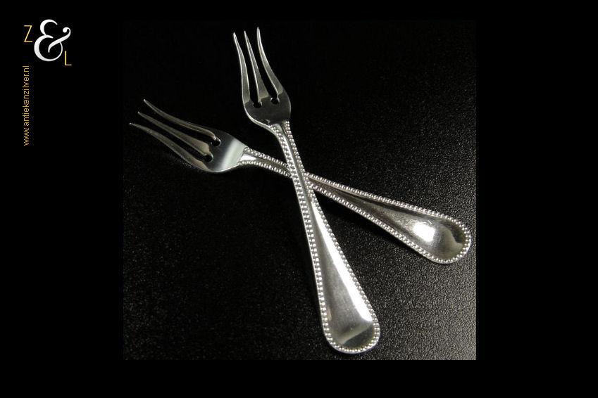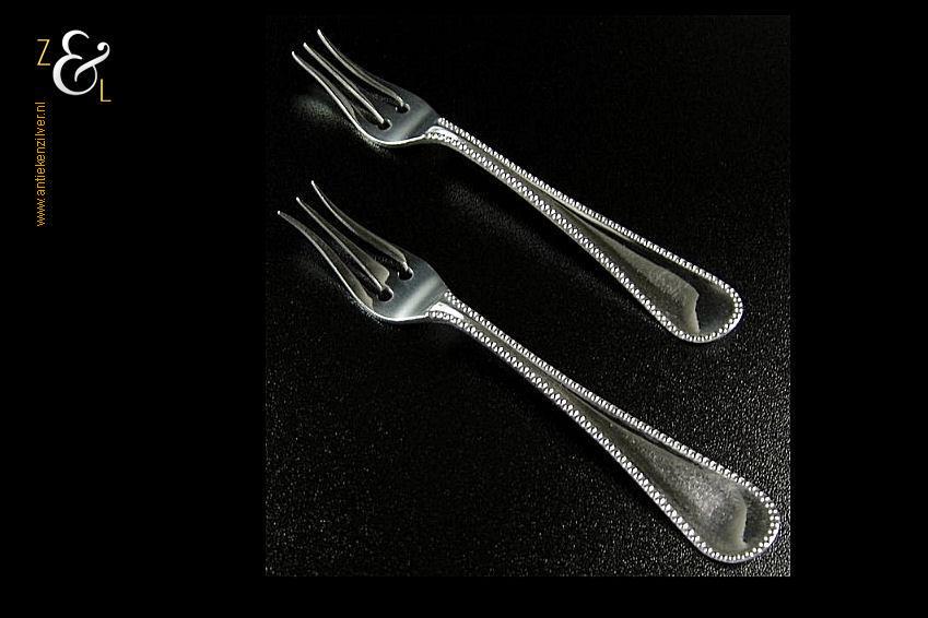 Dit stel belegvorken / stel zuurvorken is gemaakt in Voorschoten door de Firma J.M. van Kempen & Zonen (meesterteken VK liggend maantje in rechthoek) tussen de jaren 1906 en 1924 (gekeurd met het zilverkeur zwaardje). De zilveren Art Nouveau belegvorken / zuurvorken die uitgevoerd zijn met een parelrand wegen 36 gram en zijn 12.8 cm lang.