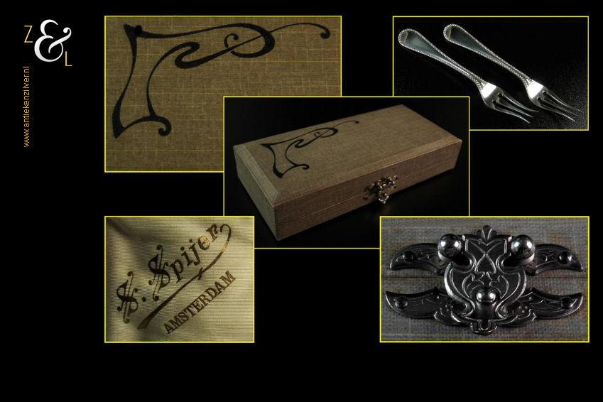 Het stel belegvorken / stel zuurvorken heeft het originele op maat gemaakte grijze foedraal (heeft gebruikssporen) van Juwelier S. Spijer te Amsterdam (zie bij de detailfoto’s het mooie Art Nouveau motief op het deksel en het Art Nouveau slotje). Het foedraal is 17.5 cm lang bij 8.2 cm breed bij 3.5 cm hoog.