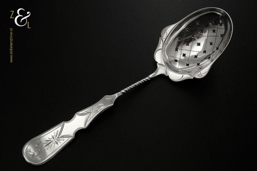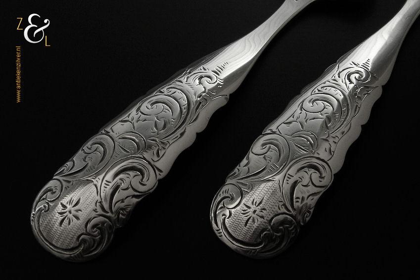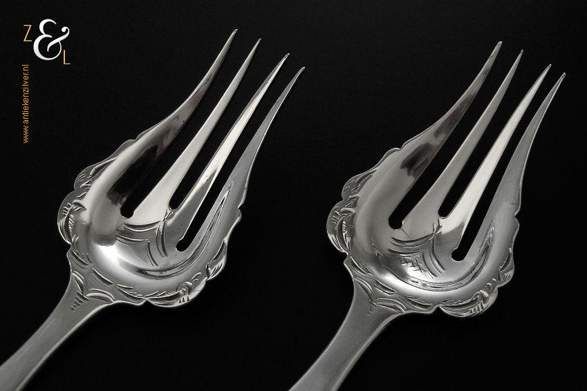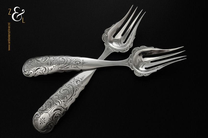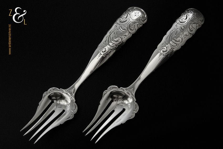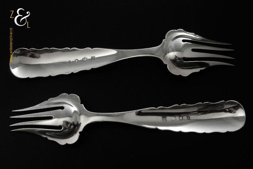 Dit stel belegvorken / stel zuurvorken is gemaakt in Amsterdam door Gerardus Wilhelmus Uriot (meesterteken GU onder ster in vierkant) in het jaar 1854 (jaarletter U). De royale zilveren Biedermeier belegvorken / zuurvorken waarvan de handvatten een diepe gravering van c-vormige voluten hebben wegen 59 gram en zijn 16.8 cm lang.