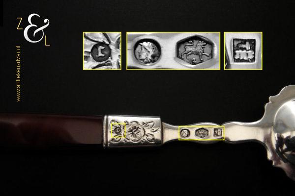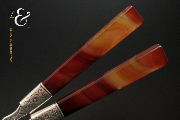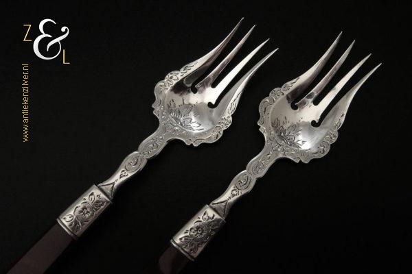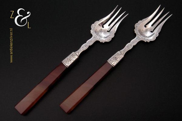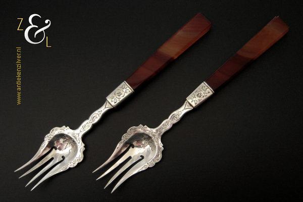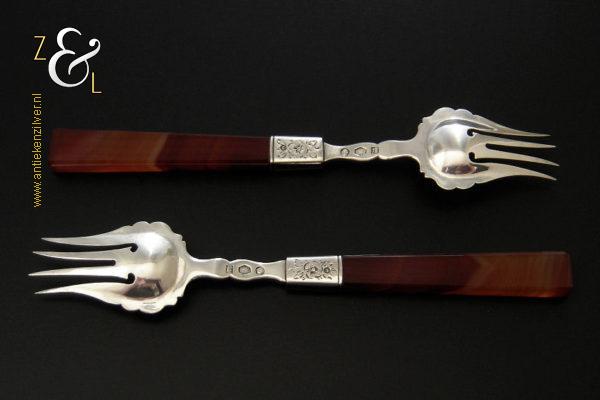 Dit stel belegvorken / stel zuurvorken is gemaakt in Amsterdam door Jacob Hendrik Schouten (meesterteken hamer boven JHS in vierkant) in het jaar 1862 (jaarletter C). De in Biedermeier stijl uitgevoerde zilveren belegvorken / zuurvorken hebben agaten handvatten en zijn gegraveerd met c-vormige voluten en bloemmotieven. De belegvorken / zuurvorken wegen 75 gram en zijn 17.8 cm lang.