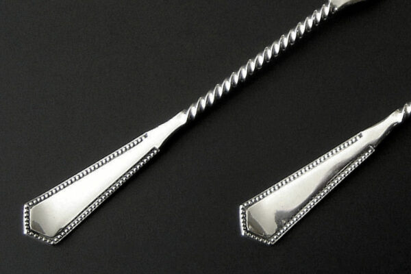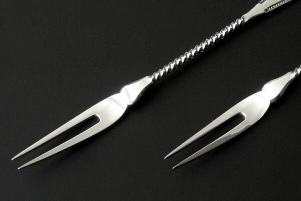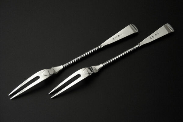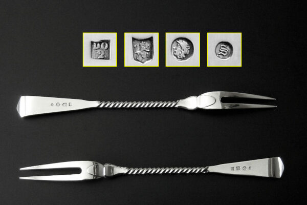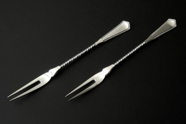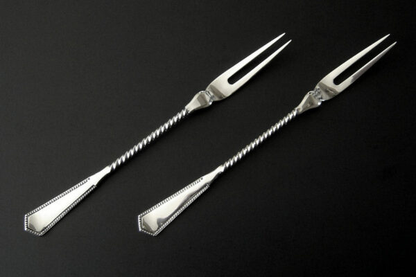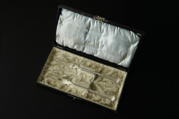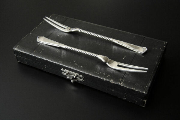 Dit stel belegvorken / stel zuurvorken is gemaakt in Amsterdam door Daniël van Outvorst (meesterteken DO boven 2 in vierkant) in het jaar 1902 (jaarletter S). Het stel belegvorken / stel zuurvorken heeft het originele zwarte foedraal (heeft gebruikssporen) en is aan de binnenzijde van het deksel gestoffeerd met lichtblauwe zijde. Verder heeft het foedraal aan de onderzijde waarin het stel belegvorken / stel zuurvorken geklemd zit een gebroken wit geplooid mohair interieur. Het 1e gehalte zilveren stel belegvorken / stel zuurvorken waarvan de stelen getordeerd zijn heeft handgrepen die uitgevoerd zijn in model parelrand. Het stel stel belegvorken / stel zuurvorken weegt 90 gram en is 20.2 cm lang. Het foedraal is 23.9 cm lang bij 12.6 breed bij 3.3 cm hoog.