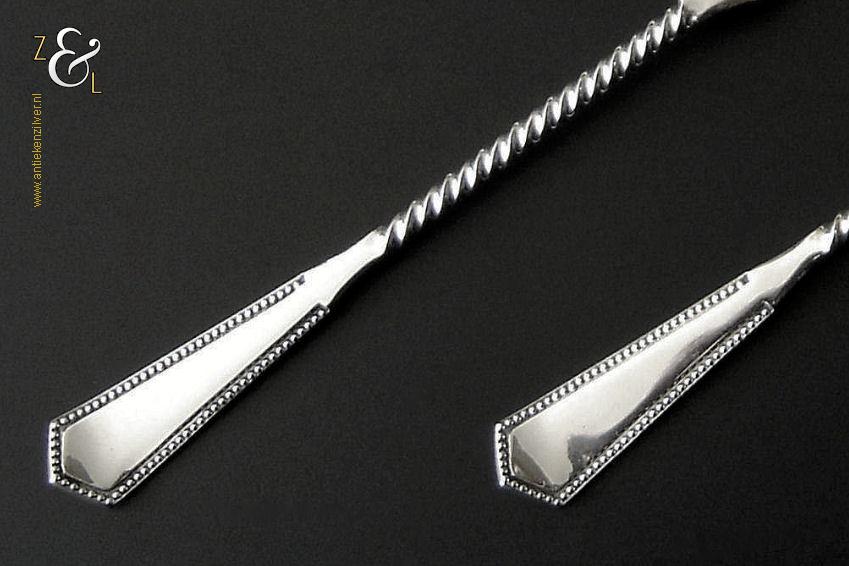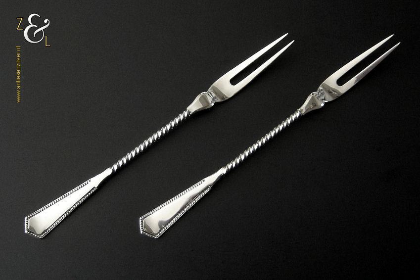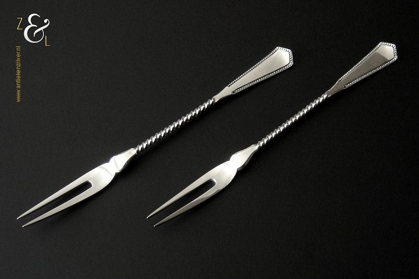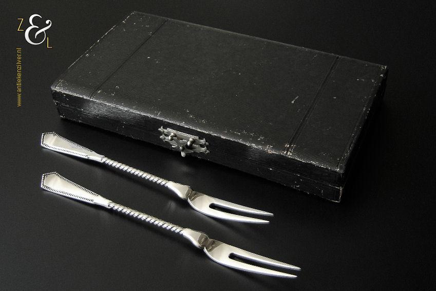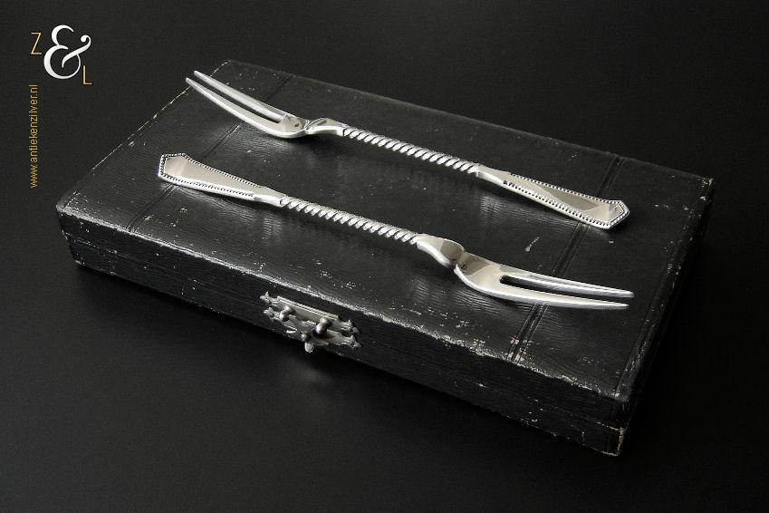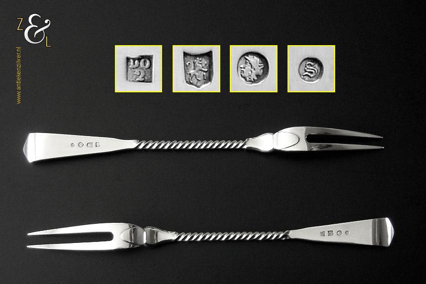 Dit stel belegvorken / stel zuurvorken is gemaakt in Amsterdam door Daniël van Outvorst (meesterteken DO boven 2 in vierkant) in het jaar 1902 (jaarletter S). Het stel belegvorken / stel zuurvorken heeft het originele zwarte foedraal (heeft gebruikssporen) en is aan de binnenzijde van het deksel gestoffeerd met lichtblauwe zijde. Verder heeft het foedraal aan de onderzijde waarin het stel belegvorken / stel zuurvorken geklemd zit een gebroken wit geplooid mohair interieur. Het 1e gehalte zilveren stel belegvorken / stel zuurvorken waarvan de stelen getordeerd zijn heeft handgrepen die uitgevoerd zijn in model parelrand. Het stel stel belegvorken / stel zuurvorken weegt 90 gram en is 20.2 cm lang. Het foedraal is 23.9 cm lang bij 12.6 breed bij 3.3 cm hoog.