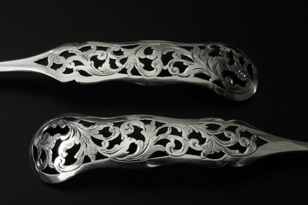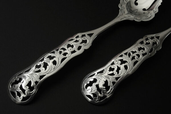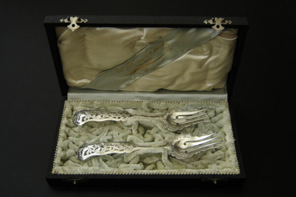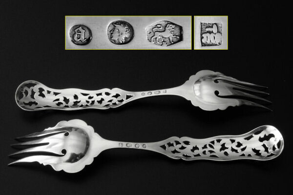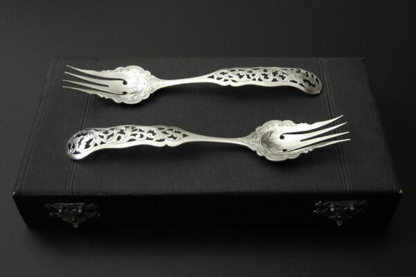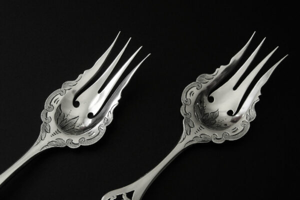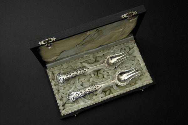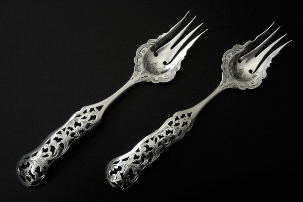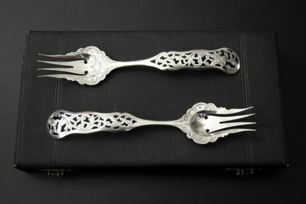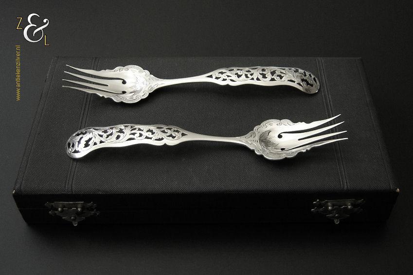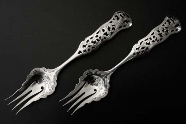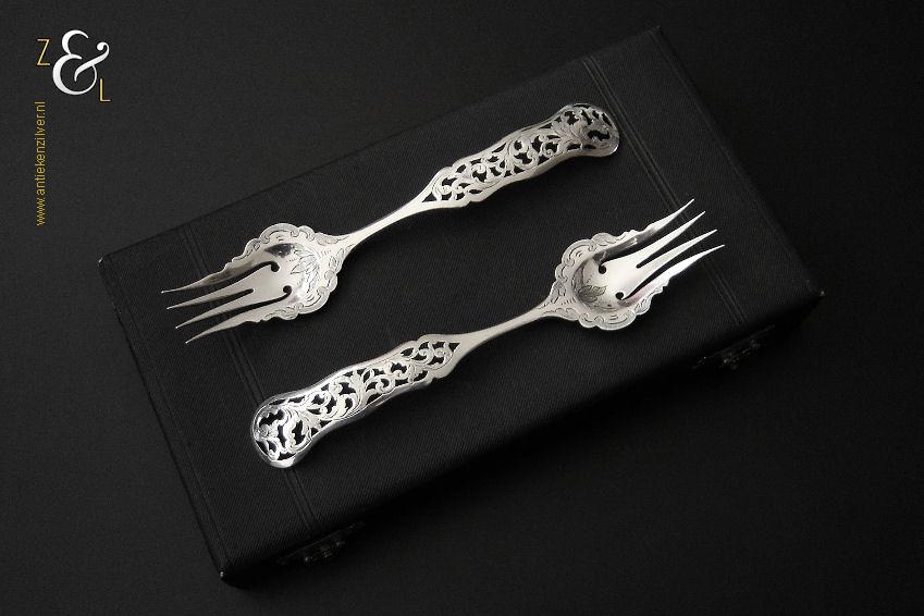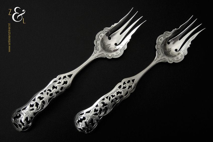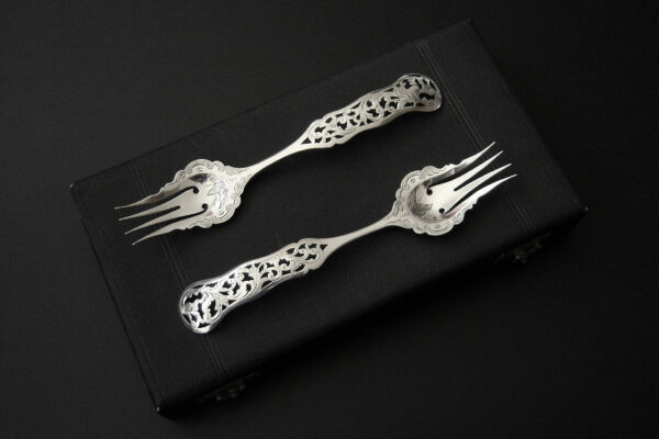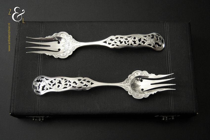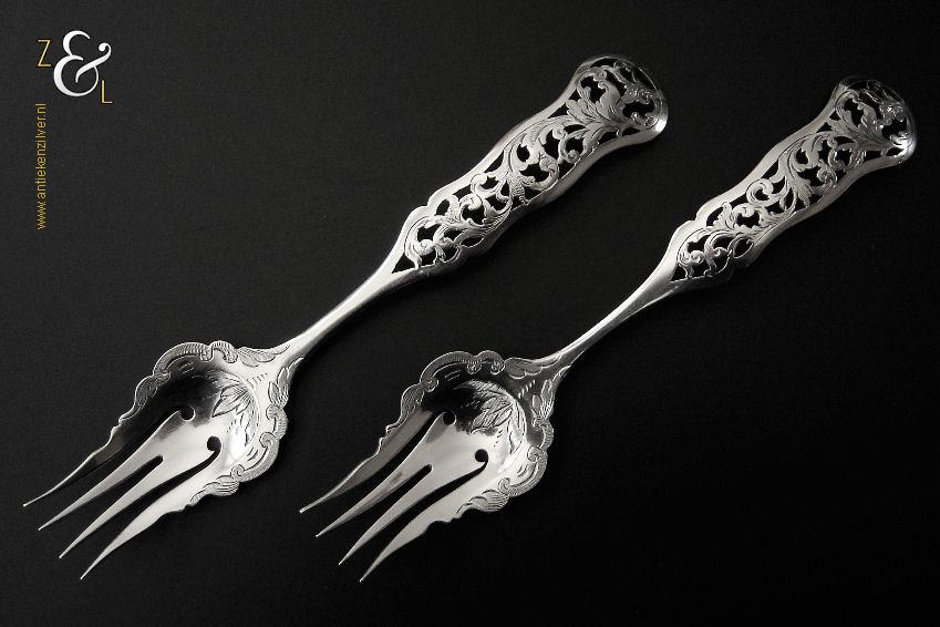 Dit stel belegvorken / stel zuurvorken is gemaakt in Amsterdam door Jacob Hendrik Schouten* (meesterteken hamer boven JHS in vierkant) in het jaar 1860 (jaarletter A). Het stel belegvorken / stel zuurvorken heeft het originele zwarte foedraal (heeft lichte gebruikssporen) en is aan de binnenzijde van het deksel gestoffeerd met goudkleurige zijde en een blauwgrijs zijden lint met in glanzend goud gedrukt: W.H. van Hattum Horloger Bijoutier Tiel* (de verkopende juwelier). Verder heeft het foedraal aan de onderzijde waarin het stel belegvorken / stel zuurvorken geklemd zit een lichtgroen geplooid velours interieur. De in Biedermeier stijl uitgevoerde zilveren belegvorken / zuurvorken hebben opengezaagde (ajour) handvatten en zijn gegraveerd met c-vormige voluten. Het stel belegvorken / stel zuurvorken weegt 53 gram en is 17.5 cm lang. Het foedraal is 22.6 cm lang bij 12.2 cm breed bij 3.3 cm hoog.