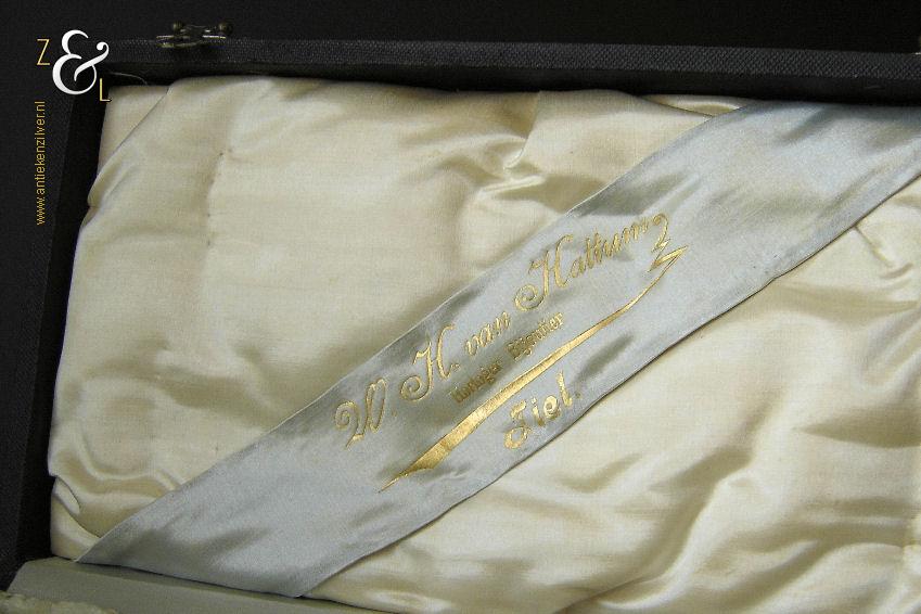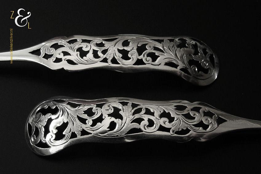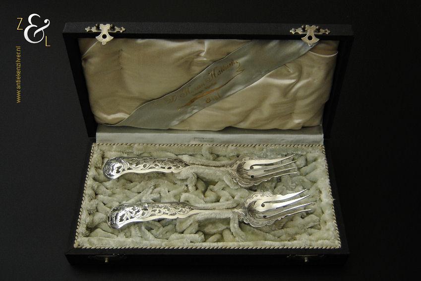 Dit stel belegvorken / stel zuurvorken is gemaakt in Amsterdam door Jacob Hendrik Schouten* (meesterteken hamer boven JHS in vierkant) in het jaar 1860 (jaarletter A). Het stel belegvorken / stel zuurvorken heeft het originele zwarte foedraal (heeft lichte gebruikssporen) en is aan de binnenzijde van het deksel gestoffeerd met goudkleurige zijde en een blauwgrijs zijden lint met in glanzend goud gedrukt: W.H. van Hattum Horloger Bijoutier Tiel* (de verkopende juwelier). Verder heeft het foedraal aan de onderzijde waarin het stel belegvorken / stel zuurvorken geklemd zit een lichtgroen geplooid velours interieur. De in Biedermeier stijl uitgevoerde zilveren belegvorken / zuurvorken hebben opengezaagde (ajour) handvatten en zijn gegraveerd met c-vormige voluten. Het stel belegvorken / stel zuurvorken weegt 53 gram en is 17.5 cm lang. Het foedraal is 22.6 cm lang bij 12.2 cm breed bij 3.3 cm hoog.