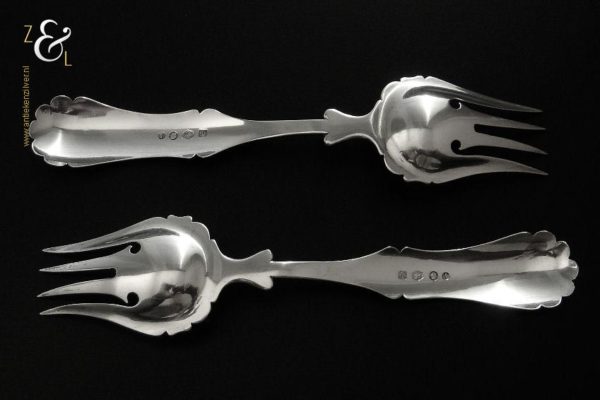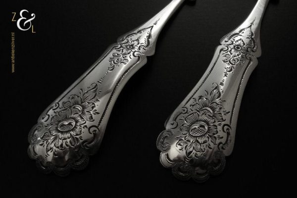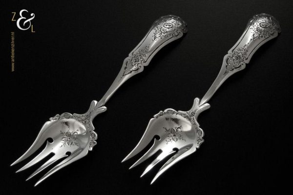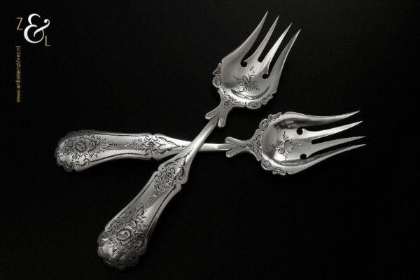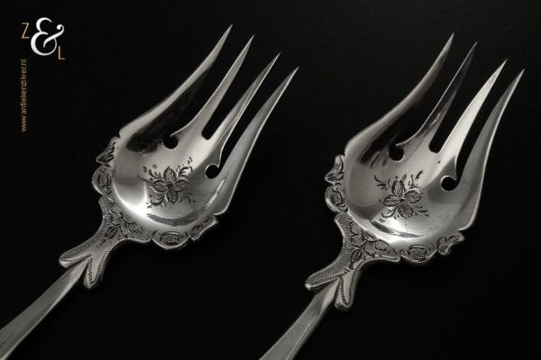 Dit stel belegvorken / stel zuurvorken is gemaakt in Amsterdam door H.A. Schuss (meesterteken HAS onder anker in vierkant) in het jaar 1858 (jaarletter Y). De royale zilveren Biedermeier belegvorken / zuurvorken hebben zowel aan het prikgedeelte als aan het handvat een diepe gravering van bloemmotieven. De vorken wegen 52 gram en zijn 16.5 cm lang.