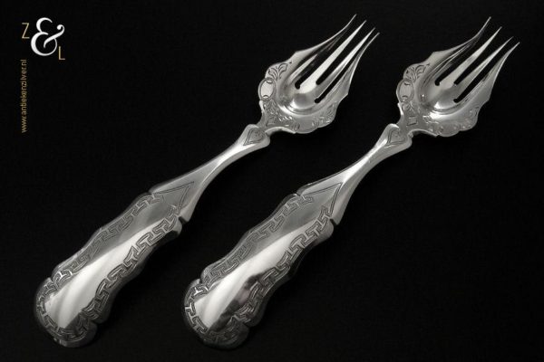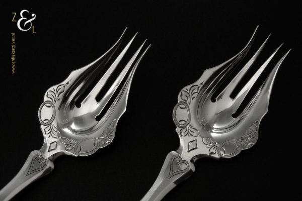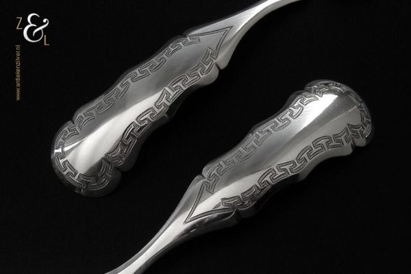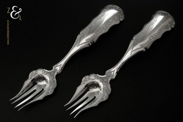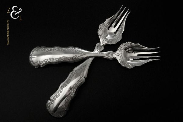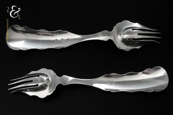 Dit stel belegvorken / stel zuurvorken is gemaakt in Schoonhoven door Adrianus Kuijlenburg Pz. (meesterteken AK boven 47 in vierkant) in het jaar 1867 (jaarletter H). De zilveren Biedermeier belegvorken / zuurvorken die gegraveerd zijn met meander-, hart-, ruit-, ring- en bladmotieven wegen 45 gram en zijn 16 cm lang.