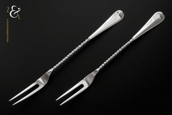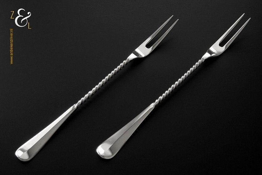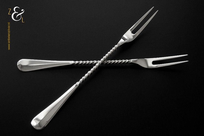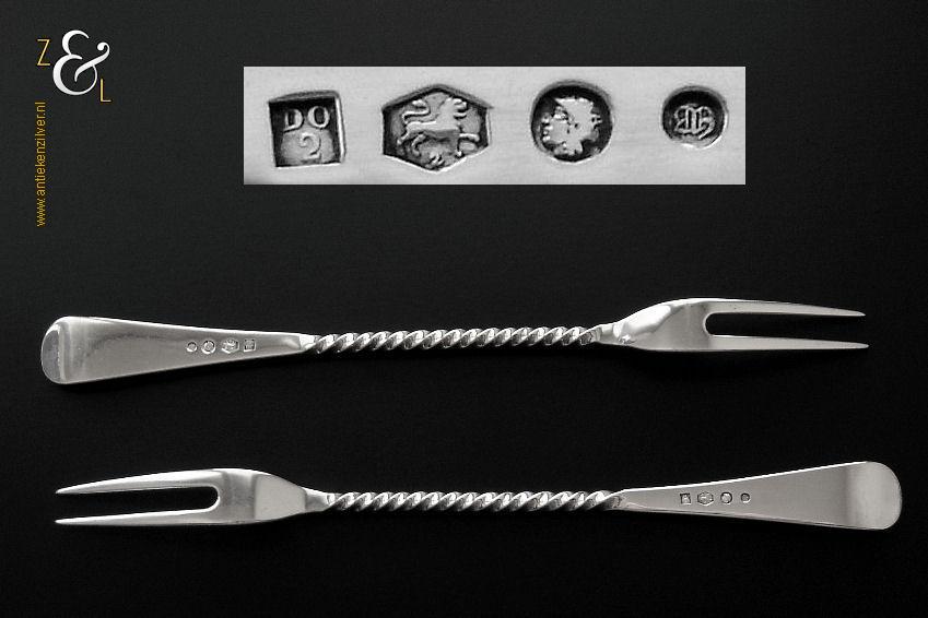 Dit stel belegvorken / stel zuurvorken is gemaakt in Amsterdam door Daniël van Outvorst (meesterteken DO boven 2 in vierkant) in het jaar 1896 (jaarletter M). Het 2e gehalte zilveren stel belegvorken / stel zuurvorken waarvan de stelen getordeerd zijn heeft handgrepen die uitgevoerd zijn in model Hollands glad. Het stel belegvorken / stel zuurvorken weegt 74 gram en is 20.8 cm lang.