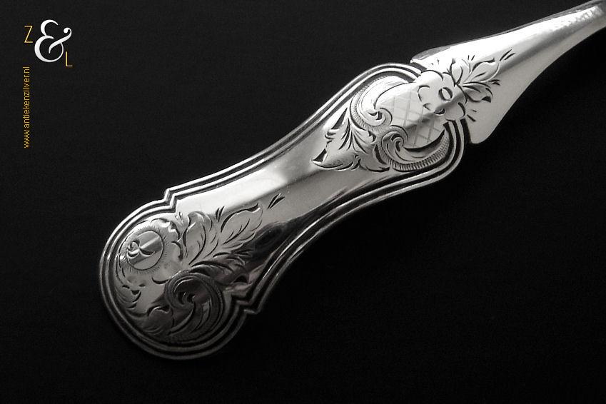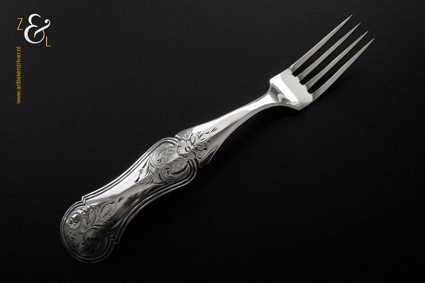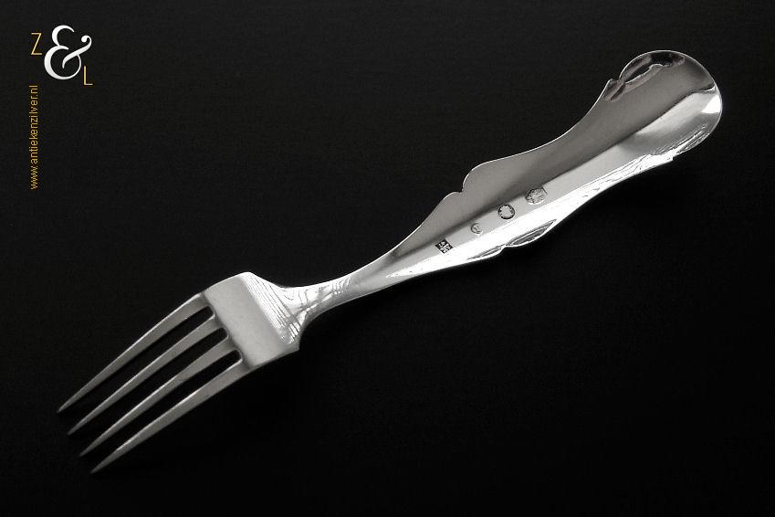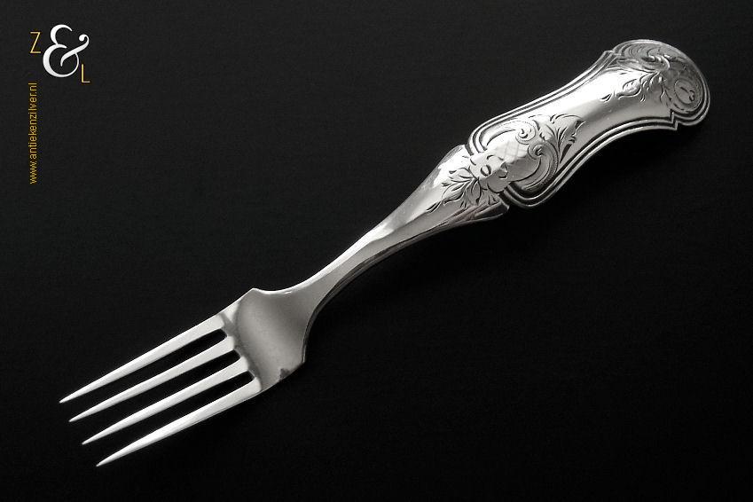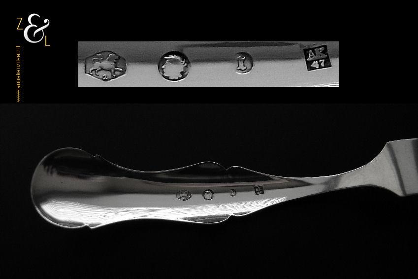 Deze confiturevork is gemaakt in Schoonhoven door Adrianus Kuijlenburg (meesterteken AK boven 47 in vierkant) in het jaar 1868 (jaarletter I). De zilveren in Neostijl uitgevoerde confiturevork waarvan het handvat uitgevoerd is met een filetrand en een gravering van bloemmotieven en c-vormige voluten weegt 12 gram en is 12.2 cm lang.