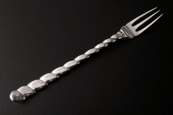Deze confiturevork is gemaakt in Amsterdam door Johannes Jacobus Torlau (meesterteken J boven hartje en T in langwerpige zeshoek) tussen de jaren 1858 en 1873. De confiturevork is gekeurd met het zilverkeur zwaardje dit is een gehaltemerk voor zilveren voorwerpen dat in de periode tussen 1814 en 1905 in gebruik was. De zilveren in Neostijl uitgevoerde confiturevork die een steel in de vorm van een kabel heeft weegt 23 gram en is 13.9 cm lang.