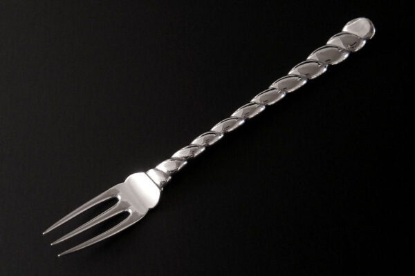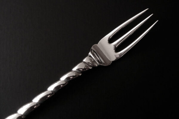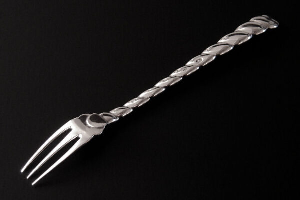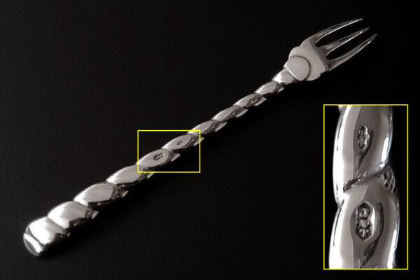 Deze confiturevork is gemaakt in Amsterdam door Johannes Jacobus Torlau (meesterteken J boven hartje en T in langwerpige zeshoek) tussen de jaren 1858 en 1873. De confiturevork is gekeurd met het zilverkeur zwaardje dit is een gehaltemerk voor zilveren voorwerpen dat in de periode tussen 1814 en 1905 in gebruik was. De zilveren in Neostijl uitgevoerde confiturevork die een steel in de vorm van een kabel heeft weegt 23 gram en is 13.9 cm lang.