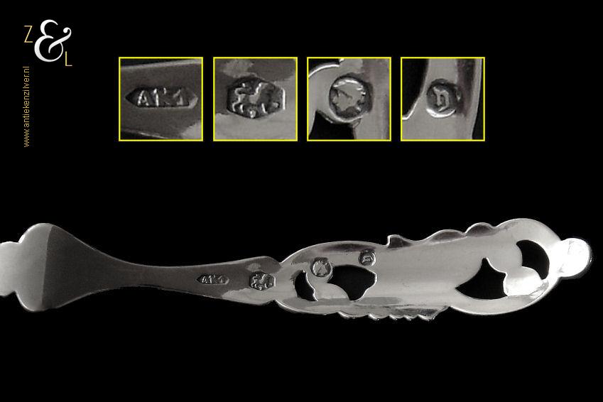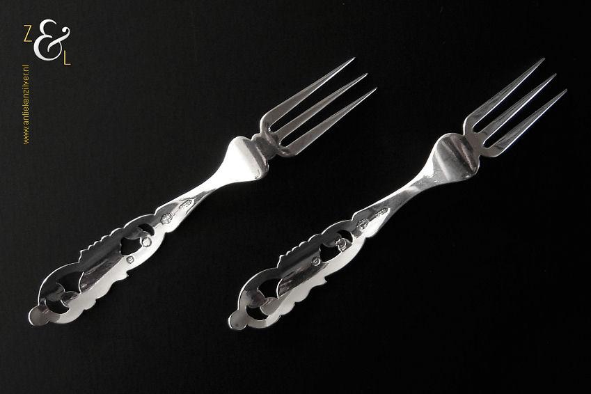 Dit stel confiturevorken is gemaakt in Den Bosch / ‘s-Hertogenbosch door Antonius Alphonsus Kalberg (meesterteken AK1 in langwerpige zeshoek) in het jaar 1883 (jaarletter Y). Het zilveren in Neostijl uitgevoerde stel confiturevorken dat 25 gram weegt is 11.9 cm lang en heeft sierlijk uitgezaagde handvatten die gegraveerd zijn met c-vormige voluten. Bij de aanzet van de vork heeft het ene vorkje een stippelgravure en het andere vorkje een bladgravure (zie geel omkaderde gedeeltes op afbeelding).