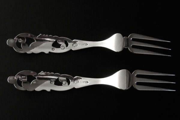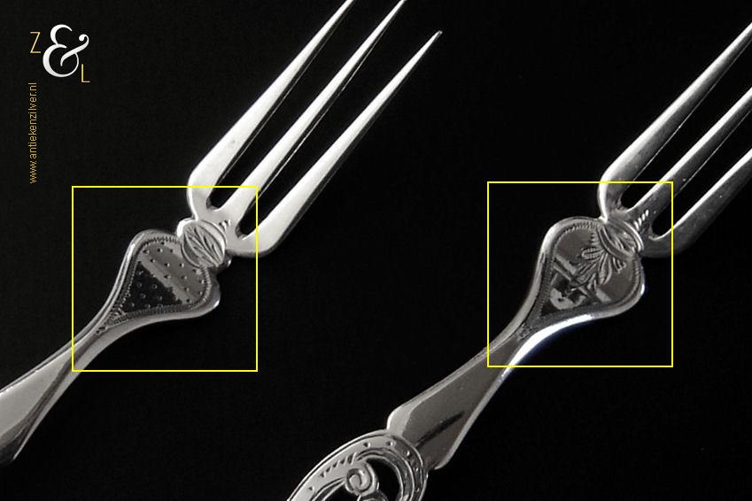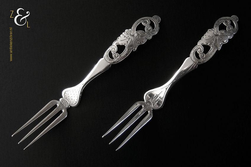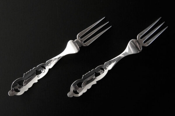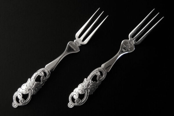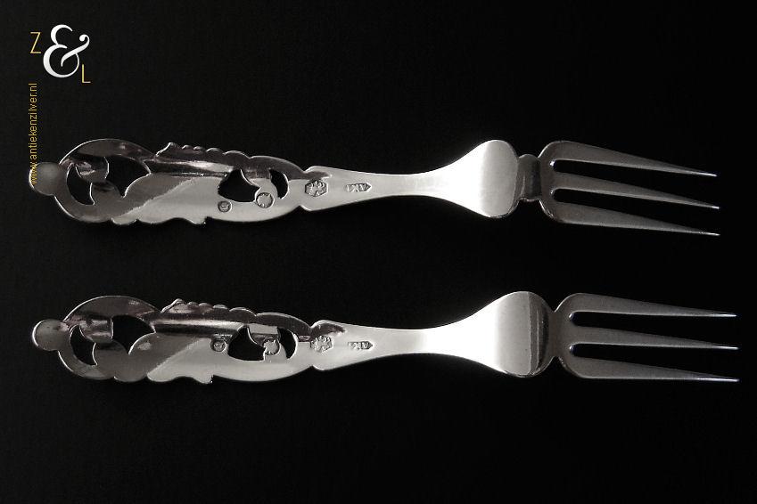 Dit stel confiturevorken is gemaakt in Den Bosch / ‘s-Hertogenbosch door Antonius Alphonsus Kalberg (meesterteken AK1 in langwerpige zeshoek) in het jaar 1883 (jaarletter Y). Het zilveren in Neostijl uitgevoerde stel confiturevorken dat 25 gram weegt is 11.9 cm lang en heeft sierlijk uitgezaagde handvatten die gegraveerd zijn met c-vormige voluten. Bij de aanzet van de vork heeft het ene vorkje een stippelgravure en het andere vorkje een bladgravure (zie geel omkaderde gedeeltes op afbeelding).