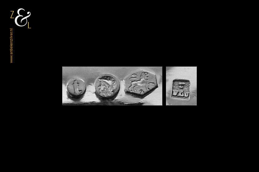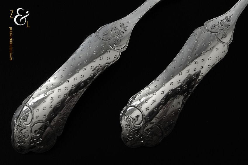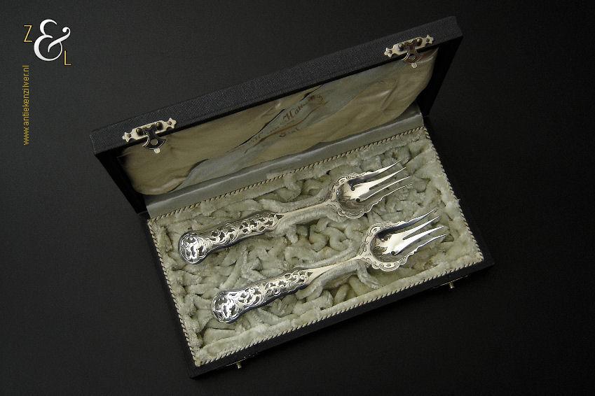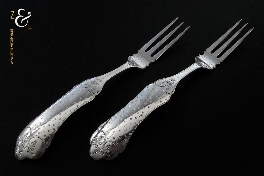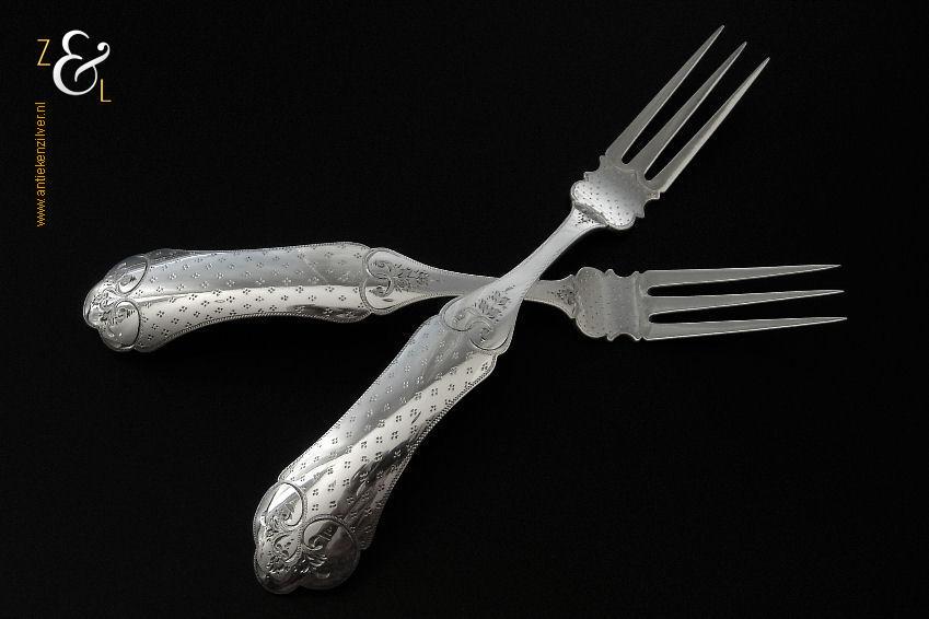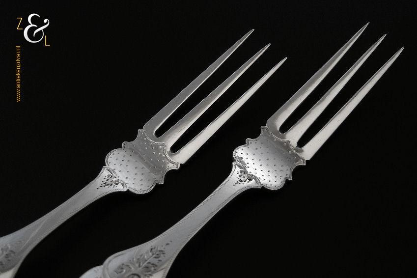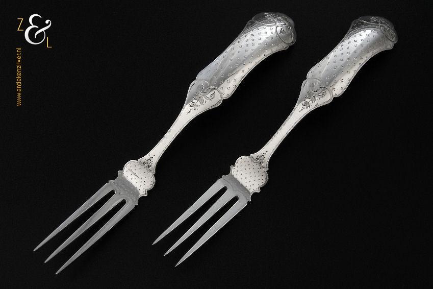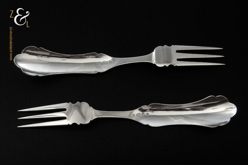 Dit stel dessertvorken / stel fruitvorken is gemaakt in Amsterdam door Theodorus Lambertus Uriot (meesterteken aambeeld boven FLU in vierkant) in het jaar 1878 (jaarletter T). De zilveren Biedermeier dessertvorken / fruitvorken zijn gegraveerd met c-vormige voluten en een stippelmotief. De dessertvorken / fruitvorken wegen 58 gram en zijn 17.8 cm lang.