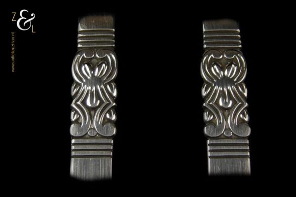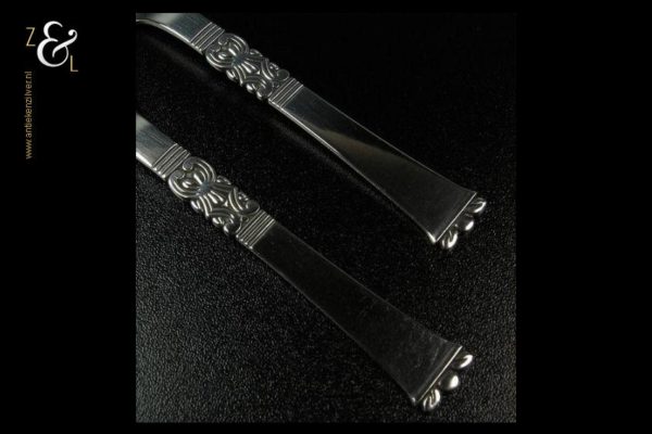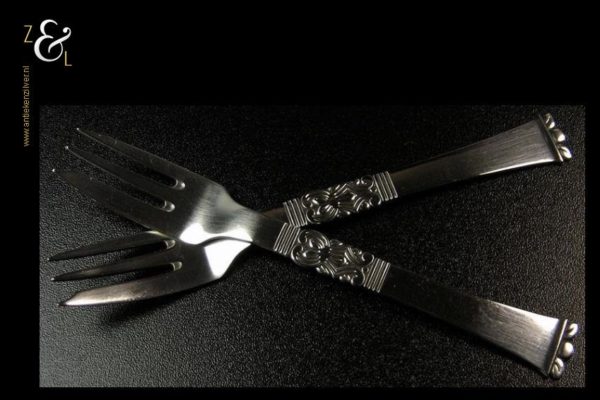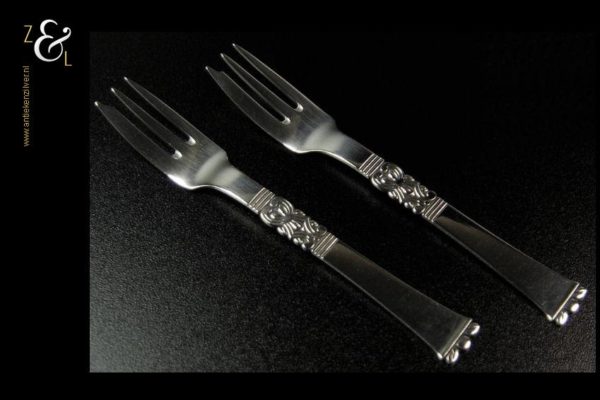 Dit stel taart- gebaksvorken is gemaakt in Kopenhagen Denemarken door Poul C. Lütken Frigast (meesterteken F in cirkel met punten) werkzaam van 1915 tot 1976. De vorken zijn gestempeld met het essayeursmerk JS in ovaal dat staat voor essayeur Jens Sigsgaard werkzaam van 1932 tot 1960 en het zilverkeur drie torens met daaronder het getal 47 duidend op het jaartal 1947 dit is het jaar waarin het stuk gemaakt is. De zware zilveren vorken zijn 13.1 cm lang en wegen samen 46 gram.