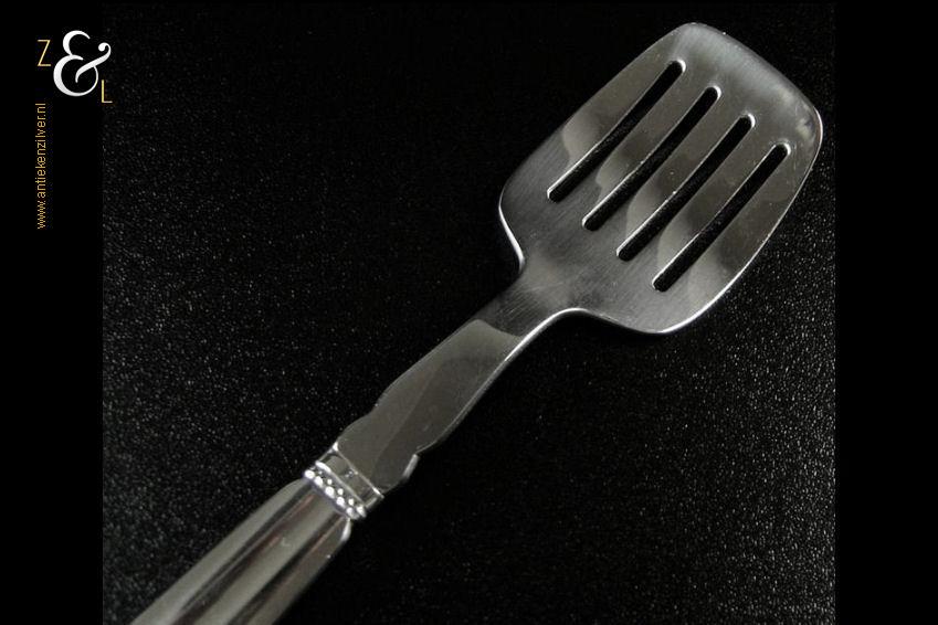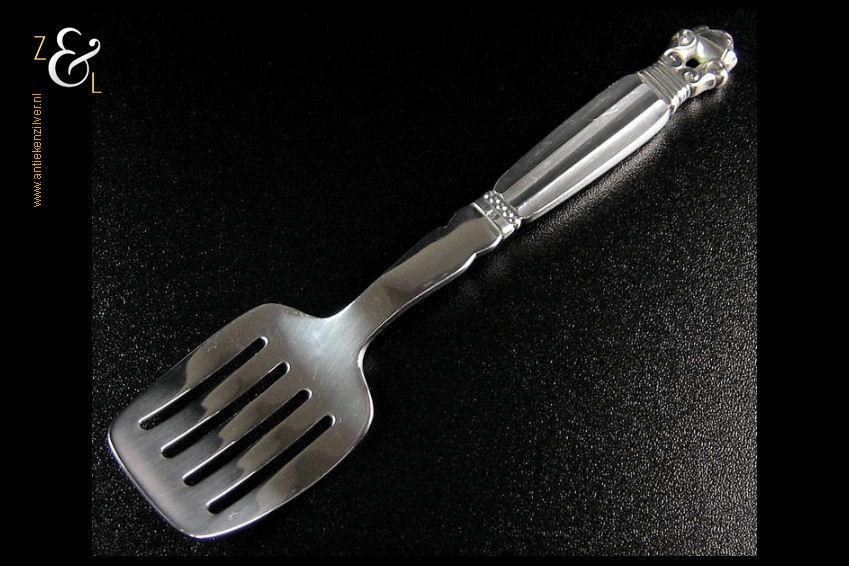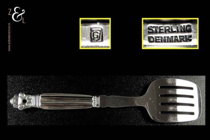 Dit sardienschepje / sardineschepje / haringschepje (uitgevoerd in het Acorn model ontworpen door Johan Rohde in 1915) met zilveren handvat en roestvrijstalen schepgedeelte is gemaakt in Kopenhagen Denemarken bij de wereldberoemde zilversmederij van Georg Jensen (meesterteken G in J in rechthoek) dit meesterteken was in gebruik tussen 1933 en 1944. Tevens is deze vork gekeurd met STERLING DENMARK een aanduiding voor eerste gehalte zilver. Het sardienschepje is 16.2 cm lang en weegt 43 gram. Het roestvrijstalen schepje meet 3.5 cm bij 4.8 cm.
