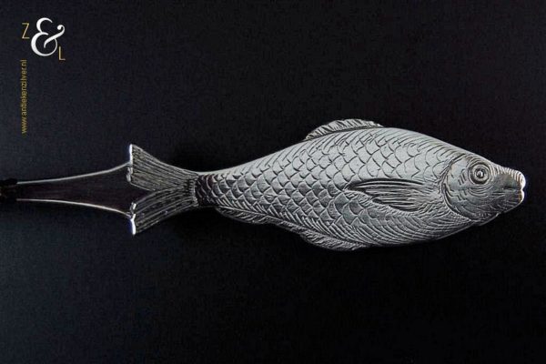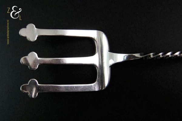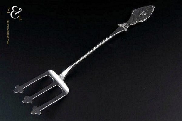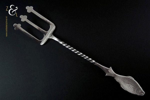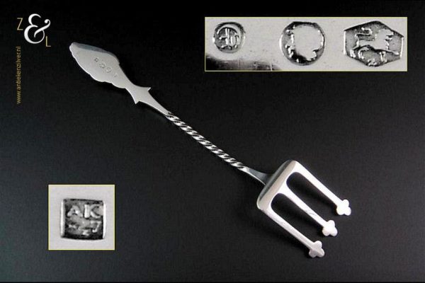 Deze sardienvork / sardinevork is gemaakt in Schoonhoven door Adrianus Kuijlenburg (meesterteken AK boven * 47 in vierkant) in het jaar 1889 (jaarletter E). De zilveren vork heeft een getordeerde steel en een gegraveerde vis als handvat. De vork weegt 25 gram en is 17.8 cm lang.