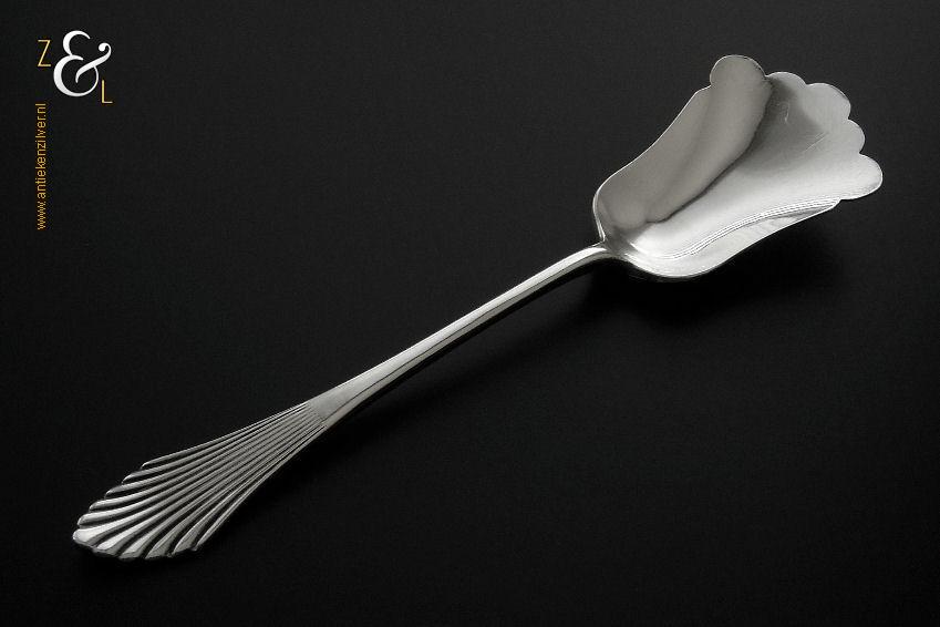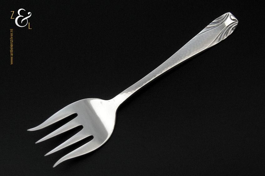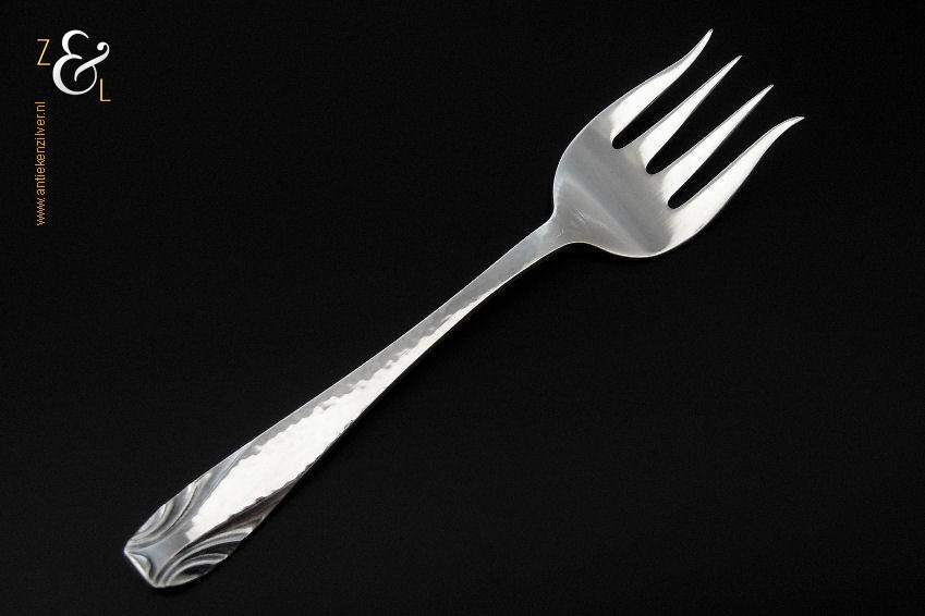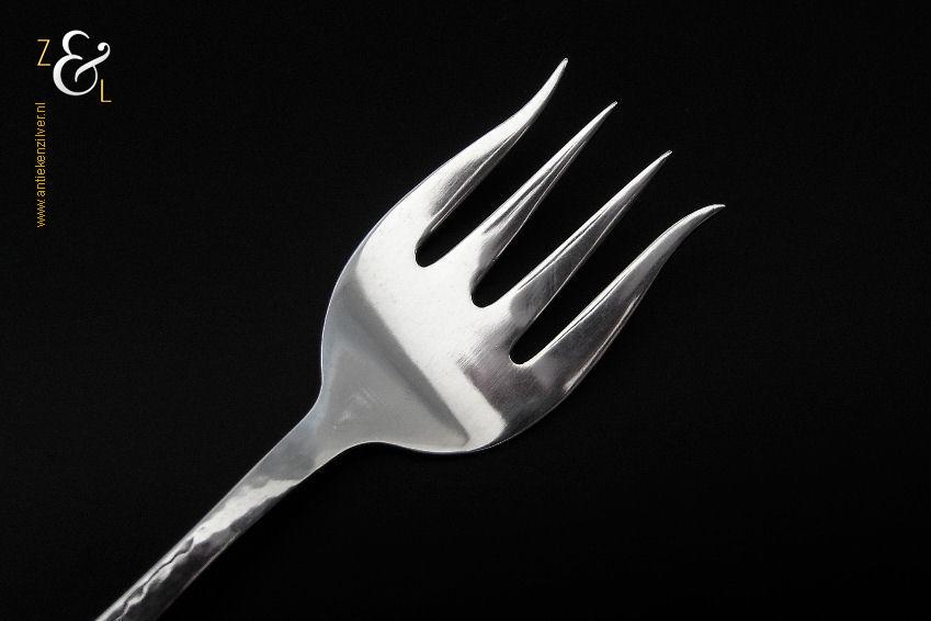 Deze sardienvork / sardinevork is gemaakt / verkocht in Amsterdam bij de (Juwelier) Firma Gebr. F.J.D. & J.F. Barends (meesterteken WB boven 2 in zeshoek) tussen 1929 en 1953 (gekeurd met het zilverkeur zwaardje). De zilveren met gehamerde steel uitgevoerde Art Deco sardienvork / sardinevork model 202 weegt 28 gram en is 13.2 cm lang.
