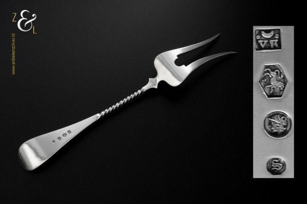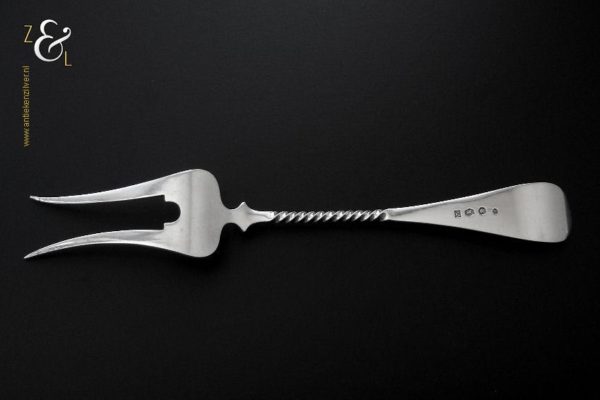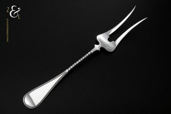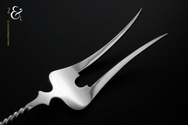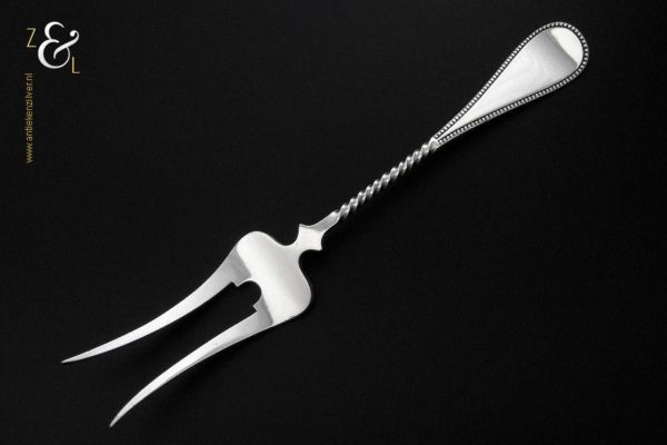 Vleesvork gemaakt in Voorschoten bij de Firma J.M. van Kempen & Zonen (meesterteken liggend maantje tussen punten boven VK in vierkant) in het jaar 1902 (jaarletter S). Deze zilveren Jugendstil vleesvork heeft een getordeerde steel en handvat met parelrand. De vleesvork weegt 63 gram en is 22.9 cm lang. De vleesvork heeft lichte gebruikssporen aan de achterzijde van de vorkpunten.