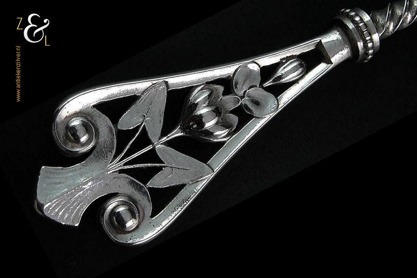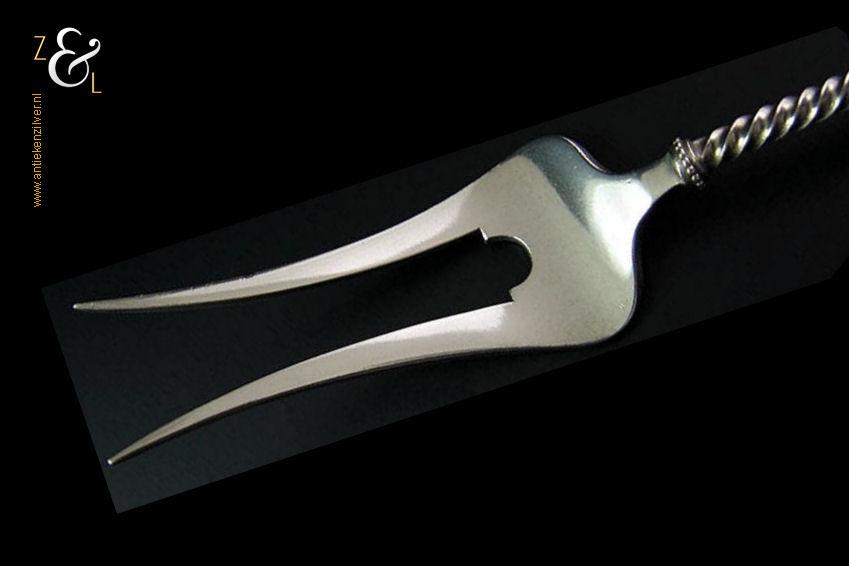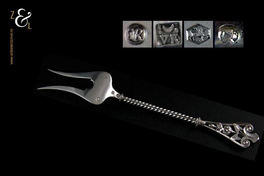 Vleesvork gemaakt in Voorschoten door de Firma J.M. van Kempen & Zonen (meesterteken liggend maantje tussen punten boven VK in vierkant) in het jaar 1901 (jaarletter R). Deze zware zilveren Art Nouveau vleesvork heeft een getordeerde steel en een gegoten handgreep, weegt 63 gram en is 22.9 cm lang.